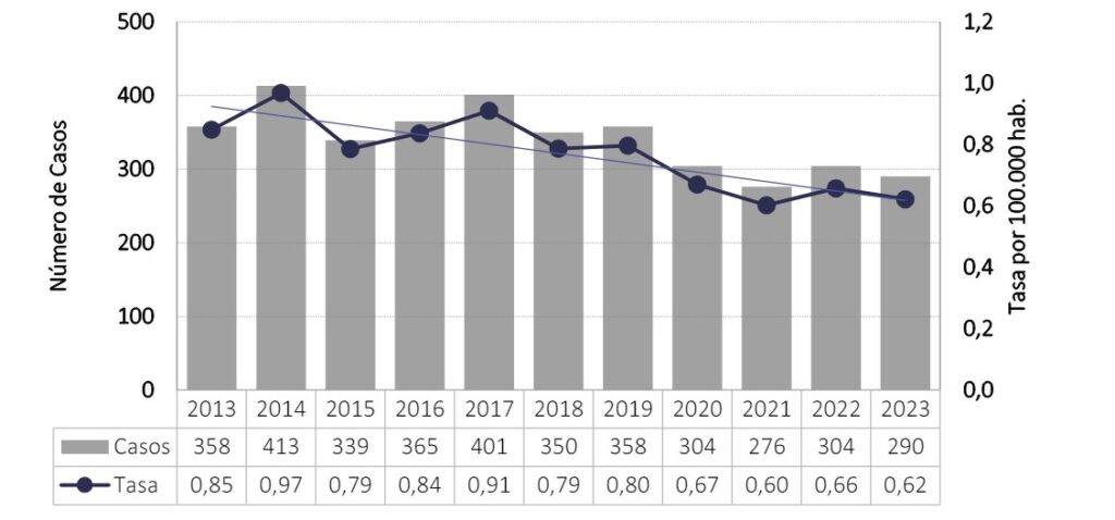 Durante el período analizado se registraron 102 casos en 2024, 39 casos menos en comparación al promedio de casos de 2014-2023).
