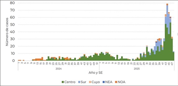 Los 765 casos confirmados superan las cifras registradas para el mismo período desde 2020, seguido del año 2023, cuando se notificó un mayor número de casos, principalmente en la provincia de Salta. La incidencia acumulada en lo que va del año es de 1,45 casos por cada 100.000 habitantes. Este incremento resulta relevante para dimensionar la situación actual, dado que el aumento de casos se observa en distintas jurisdicciones y de forma heterogénea. Además, se registraron 7 fallecimientos por la enfermedad, todos en menores de 2 años.